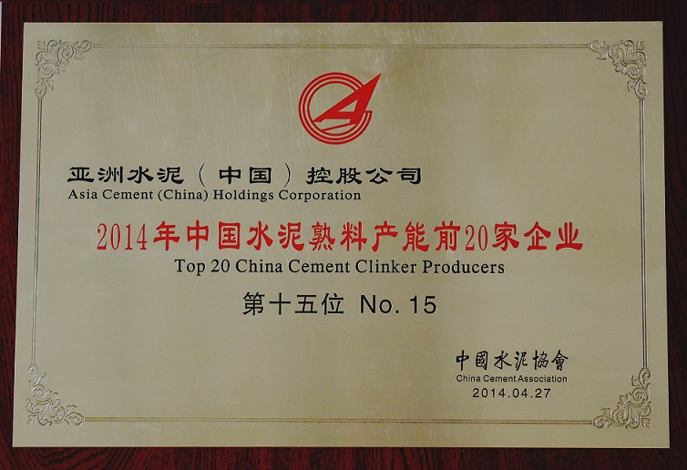 亚泥(中国)荣获2013中国熟料产能20强