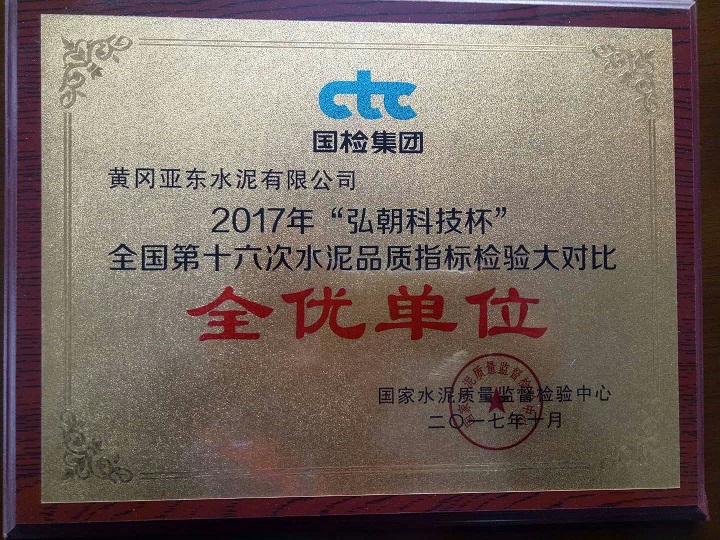 在2017年10月举办的“弘朝科技杯”全国第十六次水泥品质指标检验大对比中,黄冈亚东水泥有限公司在水泥化学物理检验指标,合计15个检验单项对比中,检验误差较小,检验精度高,获得国家水泥质量监督检测中心颁发《2017年“弘朝科技杯”全国第十六次水泥品质指标检验大对比全优单位》的殊荣。我公司未来仍将持续加强品质化验的各项管理工作,提高检验水平,以最精准的检验结果为水泥熟料生产提供优质服务及品质保障。